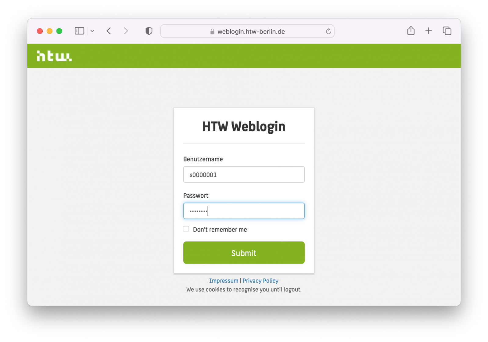 Melden Sie sich nun mit Ihrem HTW-Account an und klicken Sie anschließend auf "Submit".
