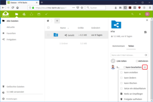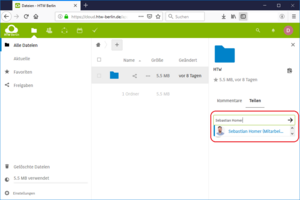In the "Share" section, enter the name of the HTW member to whom you want to share the folder/file. This can be done e.g. via the name or the HTW account user name (e.g. s0000001).