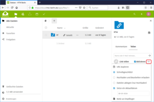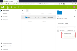 Share via a link This instruction explains how to share folders or files using a link (URL). The sharing requires password protection. In addition to this option, you can also share using external e-mail addresses. Step 1: Click on the share icon Click on the share icon next to a folder or file. Step 2: Activate share link You can use the "Activate" function to make the share link available. Step 3: Set password You will be prompted to set a password for the share after enabling the share. Enter the desired password and confirm with Enter. Step 4: Share options and link Using the three dots "..." you can copy the URL for the release, set permissions and e.g. the expiration date (default is one month).