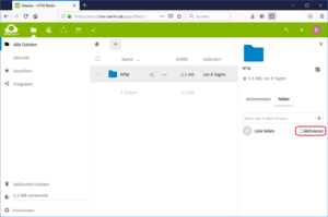 TutorialsWLAN /Wi-FiWindowsInitial setup WindowsRenew certificate WindowsAndroidInitial setup Androidrenew certificate AndroidiOSIntial setup iOSRenew certificate iOSmacOSmacOS 12 (und older)macOS 13 (and newer)LinuxFree WiFi BerlinHTW-AccountE-MailRetrieving your e-mails via the web browserManage folders in webmailerSearch your emails for keywordsYour address book in the webmailerUsing an e-mail programMozilla ThunderbirdMicrosoft OutlookWindows MailMac OS X MailMail for iOS 11 and newerAndroid (5.1 or higher)Customize e-mail addressAbsence noteForwardingInformation about spamDetermine original senderFrequently asked questionsVPNConfigure VPN Connection on Windows (OpenVPN)Configure VPN Connection on iOS (OpenVPN)Configure VPN Connection on Android (OpenVPN)Configure VPN Connection on macOS (OpenVPN)Configure VPN Connection on Linux (OpenVPN)Multi-factor authenticationCloudAccess to the HTW CloudAccess via web browserAccess via appAccess via software clientZugriff per Netzlaufwerk (Webdav) einbindenShareInternal shareExternal shareShare via a linkHorizonStorage spaceHTW-SpaceAccess on Windows 10macOSAccess on UbuntuCampus Management LSFGeneral operating instructionsSearch functionsLecture schedulesCourse catalogueEventsFrequently asked questionsLSF for studentsOnline booking of courses with LSFYour personal timetableExamsMore functionsFrequently asked questionsLSF for teachersNotes on occupancyGrade ManagementInformation and requirementsSend email to studentsConnect LSF calendar with external calendarsFrequently asked questionsEditing of module descriptionsCopying and printing at the HTW BerlinStudents and External UsersCopying at the DevicePrinting via myPrint and Public PCsPrinting/Scanning via USB StorageScan to EmailEmployees and LecturersLink Card with HTW AccountCopying at the DevicePrinting via the Inepro Enhanced Print ClientPrinting/Scanning via USB StorageScan to EmailPrice ListPublic copiersNetwork / LANWindows 10Windows 11macOSLinuxNetzwerkgeräte registrierenCentral Learning Platform MoodleAccess to MoodleGeneral InformationMoodle Video TutorialsExternal servicesZenkit TutorialsWLAN /Wi-FiWindowsInitial setup WindowsRenew certificate WindowsAndroidInitial setup Androidrenew certificate AndroidiOSIntial setup iOSRenew certificate iOSmacOSmacOS 12 (und older)macOS 13 (and newer)LinuxFree WiFi BerlinHTW-AccountE-MailRetrieving your e-mails via the web browserManage folders in webmailerSearch your emails for keywordsYour address book in the webmailerUsing an e-mail programMozilla ThunderbirdMicrosoft OutlookWindows MailMac OS X MailMail for iOS 11 and newerAndroid (5.1 or higher)Customize e-mail addressAbsence noteForwardingInformation about spamDetermine original senderFrequently asked questionsVPNConfigure VPN Connection on Windows (OpenVPN)Configure VPN Connection on iOS (OpenVPN)Configure VPN Connection on Android (OpenVPN)Configure VPN Connection on macOS (OpenVPN)Configure VPN Connection on Linux (OpenVPN)Multi-factor authenticationCloudAccess to the HTW CloudAccess via web browserAccess via appAccess via software clientZugriff per Netzlaufwerk (Webdav) einbindenShareInternal shareExternal shareShare via a linkHorizonStorage spaceHTW-SpaceAccess on Windows 10macOSAccess on UbuntuCampus Management LSFGeneral operating instructionsSearch functionsLecture schedulesCourse catalogueEventsFrequently asked questionsLSF for studentsOnline booking of courses with LSFYour personal timetableExamsMore functionsFrequently asked questionsLSF for teachersNotes on occupancyGrade ManagementInformation and requirementsSend email to studentsConnect LSF calendar with external calendarsFrequently asked questionsEditing of module descriptionsCopying and printing at the HTW BerlinStudents and External UsersCopying at the DevicePrinting via myPrint and Public PCsPrinting/Scanning via USB StorageScan to EmailEmployees and LecturersLink Card with HTW AccountCopying at the DevicePrinting via the Inepro Enhanced Print ClientPrinting/Scanning via USB StorageScan to EmailPrice ListPublic copiersNetwork / LANWindows 10Windows 11macOSLinuxNetzwerkgeräte registrierenCentral Learning Platform MoodleAccess to MoodleGeneral InformationMoodle Video TutorialsExternal servicesZenkit HTW Berlin Information Technology Centre Tutorials Cloud Share Share via a link Share via a link This instruction explains how to share folders or files using a link (URL). The sharing requires password protection. In addition to this option, you can also share using external e-mail addresses. Step 1: Click on the share icon Click on the share icon next to a folder or file. Step 2: Activate share link You can use the "Activate" function to make the share link available. Step 3: Set password You will be prompted to set a password for the share after enabling the share. Enter the desired password and confirm with Enter. Step 4: Share options and link Using the three dots "..." you can copy the URL for the release, set permissions and e.g. the expiration date (default is one month).